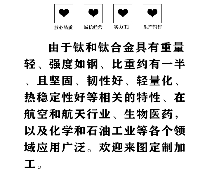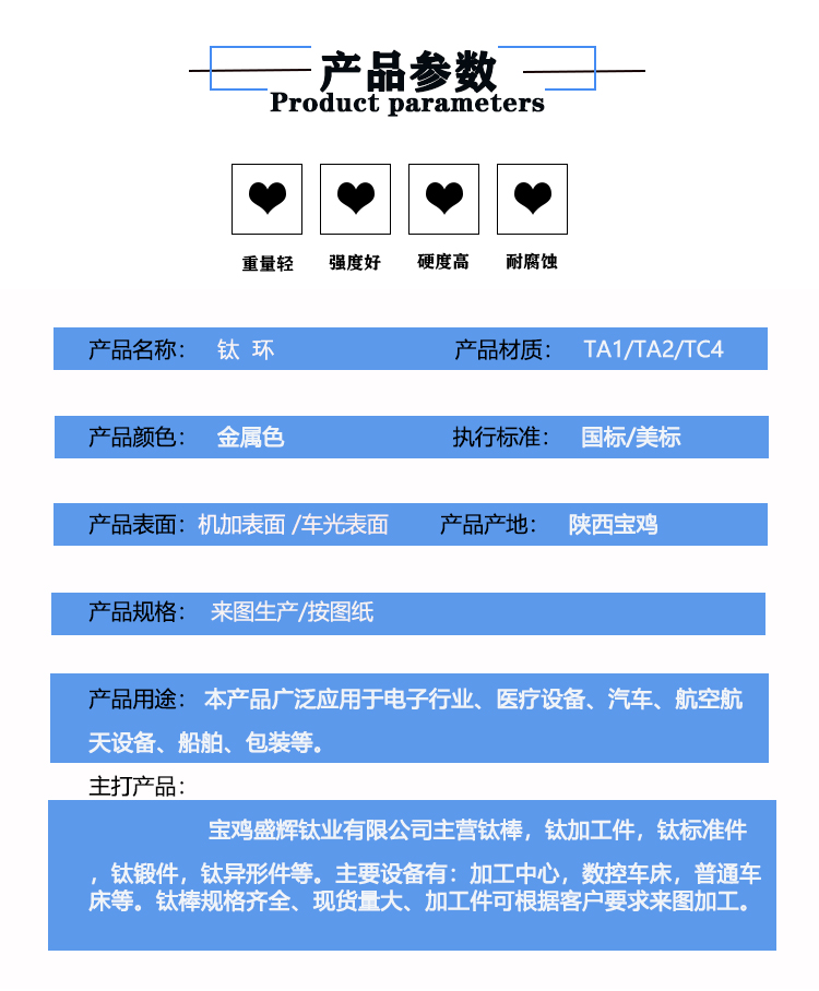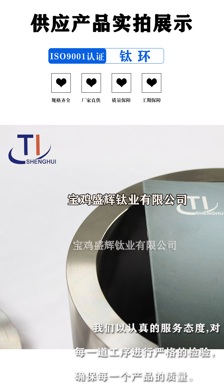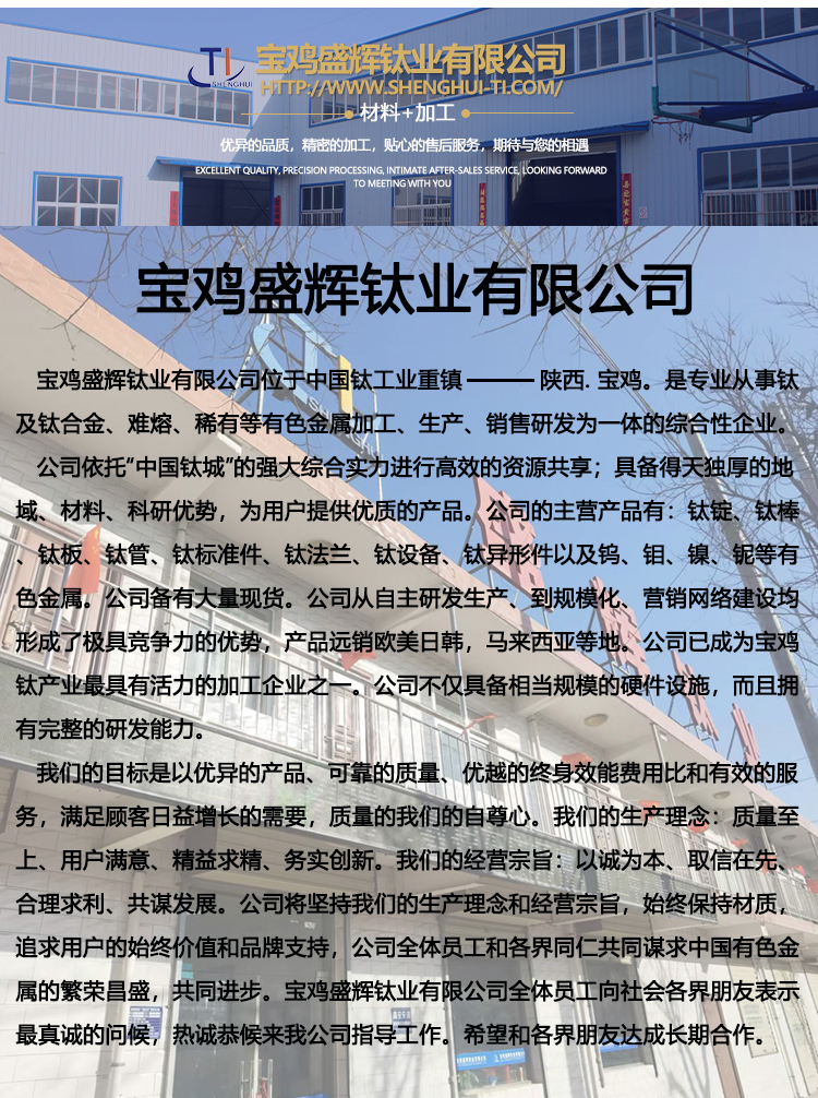 寶雞盛輝鈦業有限公司是一家主要從事鈦及鈦合金棒,鈦環,鈦法蘭及鈦合金板材的高新技術企業,公司提供鈦環,鈦合金棒批發,鈦環的生產工藝服務,以人為本,質量取勝為宗旨:18791863990,18740375975